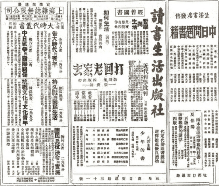 这些广告一共推荐了五十多种读物,大部分都与抗战有关。其中一大类是日本研究图书,如中外学者撰写的《日本的透视》《当日本作战的时候》《今日的日本》《日本的大陆政策》《日本大陆政策的真面目》《日本的财阀军部与政党》《日本财阀史话》《日本军部与法西斯蒂》《被包围的日本》等,从政治、经济、军事、社会等多个角度,剖析日本军国主义,使读者对这个劲敌有更全面的深刻认知。